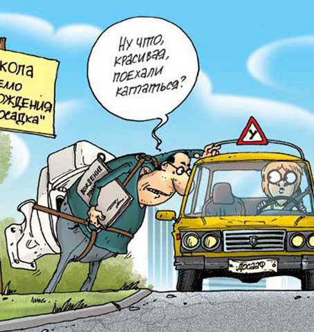 -Давай я пойду учиться в автошколу. Получу права - поедем путешествовать. Свет повидаем. А он мне: -Тот или этот? | -Дорогой, поздравь меня. Я получила права. Завтра на одного пешехода будет меньше. -Дорогая, думаю, что будет гораздо больше, чем на одного. |